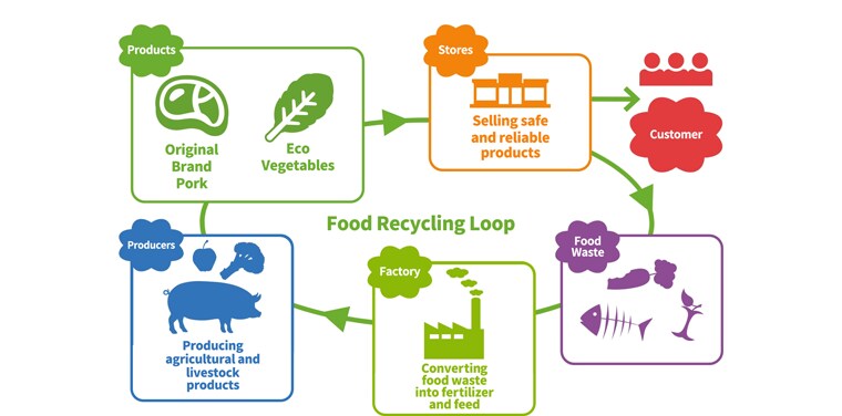 UNY has formed partnerships with local recycling businesses and agricultural producers, and has constructed a food recycling loop in which Pork, Eggs and Vegetables produced using recycled feed and fertilizer are sold in UNY stores.