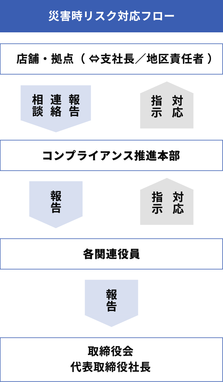 PPIHグループでは、コンプライアンス推進本部にてリスク管理を行っています。店舗・拠点で発生するリスク事案に関わる情報収集、リスク対応及び対策を決定し、店舗・拠点はその指示に基づき実行しています。進捗状況についてはコンプライアンス推進本部がモニタリングし、必要に応じて取締役会に報告しています。